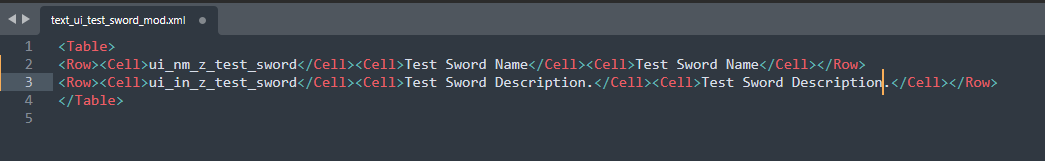 After packing, the file text_ui_test_sword_mod.xml can be deleted. We only need the pak file. By the same principle you can create localization to other languages. In the localization file, you should enter the translation on the right side, and leave the text in English on the left side.